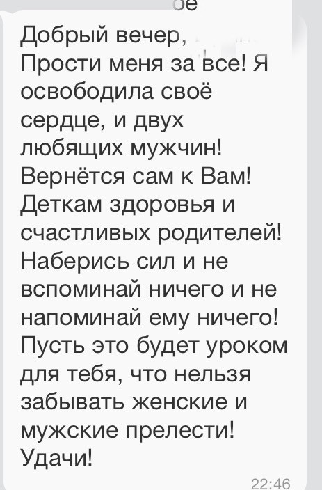 Кстати, она глупая не думала, что я прочитаю это сообщение быстро, удалила его и новое выслали уже без двух любящих мужчин, а просто, что она сердце своё освободила ). Остальное содержание осталось неизменным