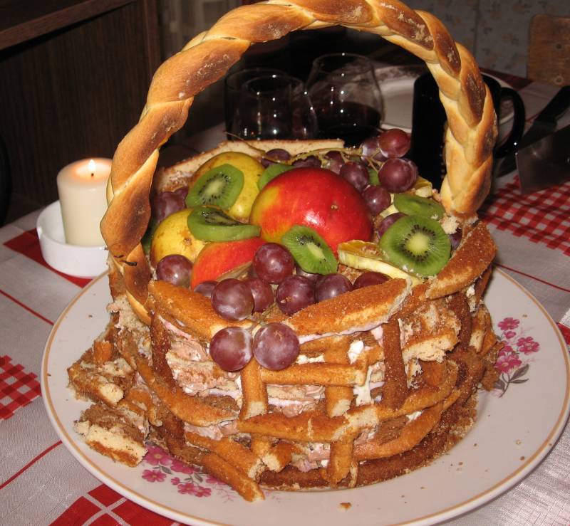 | Elizzaveta, тортик, немного осыпался. Самое хитрое - испечь ручку: сама допетрила, как. До эстетически высшего пилотажа мне далеко: женщины натурально плетут корзину:)