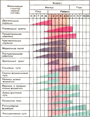 Есть такая красивая инфографика в учебнике детской неврологии - сроки дозревания (миелинизации) структур головного мозга. Вот она:
