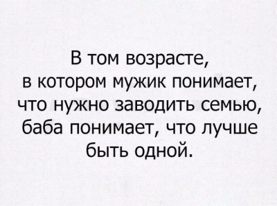 Цитата la777 (  ) "Семья - мой смысл жизни!" - сказал мужчина, облизывая любовницу по четвертому кругу. Семья = дети и положение семьянина в обществе. Еще ни один мужчина не мечтал жениться прежде получения образования или жил ожиданием этого события. А вот женщина, как бы парадоксально не прозвучало, в мужчине видит бога. Ушел бог, нет веры, нет смысла. Даже дети не радуют. Вон сколько постов из серии анонимных алкоголиков: "я одна с ребенком, разведена, есть жл, но меня ничего не радует, ребенок убирает за мной бутылки".Добавлено (29 Апреля 2017, 16:14) ---------------------------------------------
