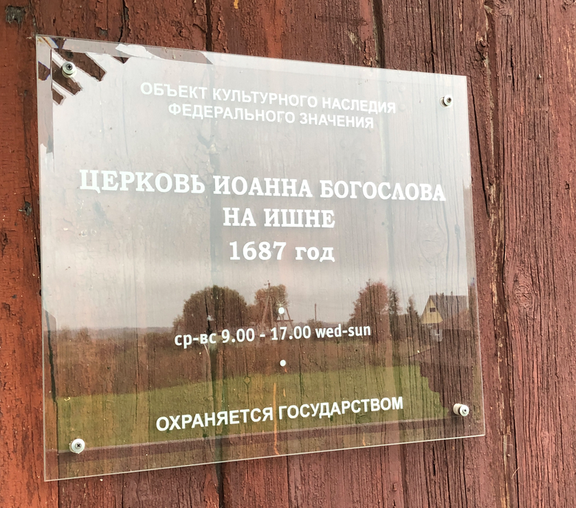 Потом опять проехали по городу. Самое главное - доехали до моей любимой церкви Богослова на Ишне. У входа новая табличка с часами работы. В понедельник и вторник - не работает.
