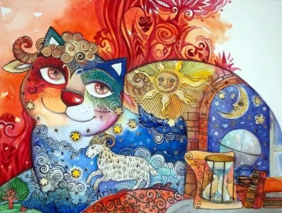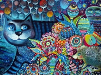 Оксана Заика и ее красочные декоративные коты. Окончила художественное училище им. Калинина в г. Москве, затем курсы иконописи и батика. Рисует везде и на всех материалах. На данный момент проживает во Франции, в Лионе.
