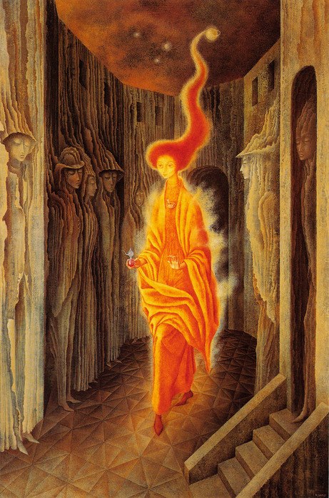 Более современное явление - сюрреализм. Недавно открыла для себя Ромедиос Варо. Обилием мелких деталей её живопись напоминает Босха. Была знакома с Фридой Кало.