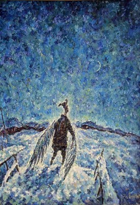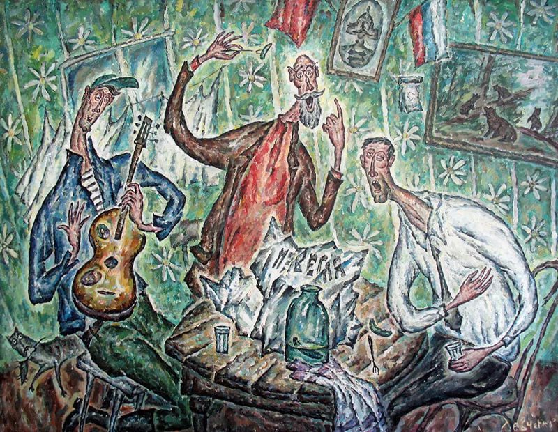 | прекрасный Левченко. Краснодарский край. Прекрасный для меня тем, что это единственный знакомый художник - из мертвых и живых - которому поровну досталось от сцепленного гена поэзии и живописи. Все люди, способные к живописи, могут и написать несколько строчек. Все поэты могут чего-то намалевать (помните головки Пушкинские на рукописях). Но фишка в том, что всегда чего-то одно доминирует. И если литераторы с большой иронией относятся к себе-рисовальщикам, то художники иногда на полном серьезе считают, что пишут. Оно понятно - литература, как искусство, требует более высокого интеллекта, в разы. Но вот Левченко... Когда этот рыжий ироничный алкаш выпустил книгу стихов "Валенки самурая" - она мгновенно разлетелась по сети и собрала тысячи офигевшего народу навсегда в почитатели Ле-Вчен-Ко. Это просто клево. Он хороший художник и хороший поэт. Удивительно. Сперва художник: