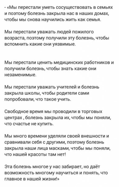 | Каркуша, Цитата увы, не можем убрать от людей эти бомбы замедленного действия, это могут сделать те, кто самоизолировался от граждан и предоставил их самим себе, упорно не желая вводить режим ЧС и карантин, положившись, как раз именно на "русский авось", мол само рассосется.