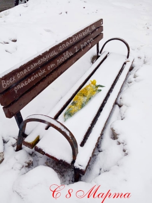 | Дорогие и уважаемые Спасательницы, Спасённые и Спасаемые!!! Поздравляю всех вас с весенним женским днём!!! Специально для вас сделала "открыточки". Мимоза от незнакомого мужика, лавочка от "моего подъезда", снег от природы, надписи от меня.) Пока первая.