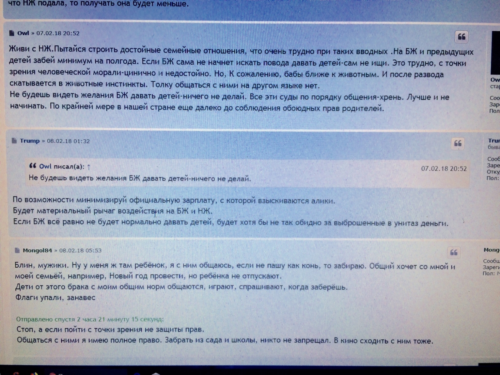 Цитата Winter (  ) Ну там же написано Там ещё много чего написано) Про материальный рычаг воздействия на БЖ и НЖ. Что алики - деньги, выброшенные в унитаз (если общение отца и ре не налажено). Не стала выкладывать скрин темы, где мужчина с новой женой договорились, чтобы она в браке подала на алименты и раздел имущества, чтобы бывшей с детьми меньше досталось. Разумно, чо) Я в какой-то теме написала, что довольно частая история, когда БМ с НЖ, стоя спиной к спине, "отстреливаются" от БЖ с детьми, как Мистер и миссис Смит в одной сценке в одноимённом фильме. Помню, кого-то это сильно задело) Хорошо, что здравый смысл чаще берёт верх, и люди всё-таки договариваются обо всём мирно. Как Мерида со своим БМ
