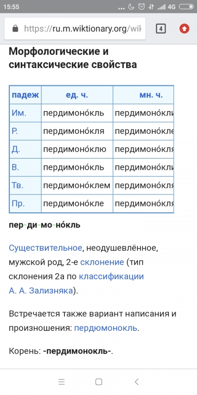 | Gela55, простите, пож-та, меня. Не смогла пройти. Зачем было писать такую длинную речь? Вы же взрослый человек. Вас хотели задеть, Вы повелись сразу. Прошли бы мимо. Вот я бы это отметила Вам в плюс. Я вот совершенно безграмотна. Но я , если даже пищу с телефона, он меня исправляет постоянно )) Другое дело, я могу на это не обратить внимание, чтобы не потерять ход мысли. И, то, что я хотела сказать , вернее что в инете нашла : Морфологические и синтаксические свойства падеж ед. ч. мн. ч. Им. пердюмоно́кль пердюмоно́кли Р. пердюмоно́кля пердюмоно́клей Д. пердюмоно́клю пердюмоно́клям В. пердюмоно́кль пердюмоно́кли Тв. пердюмоно́клем пердюмоно́клями Пр. пердюмоно́кле пердюмоно́клях пер-дю-мо-но́кль