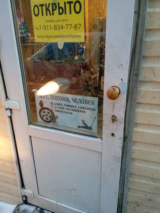 Сегодня муж с утра заехал на шиномонтаж неподалеку от нас, на р. Пряжке. Шиномонтаж называется "Кот, ворона, человек" smile