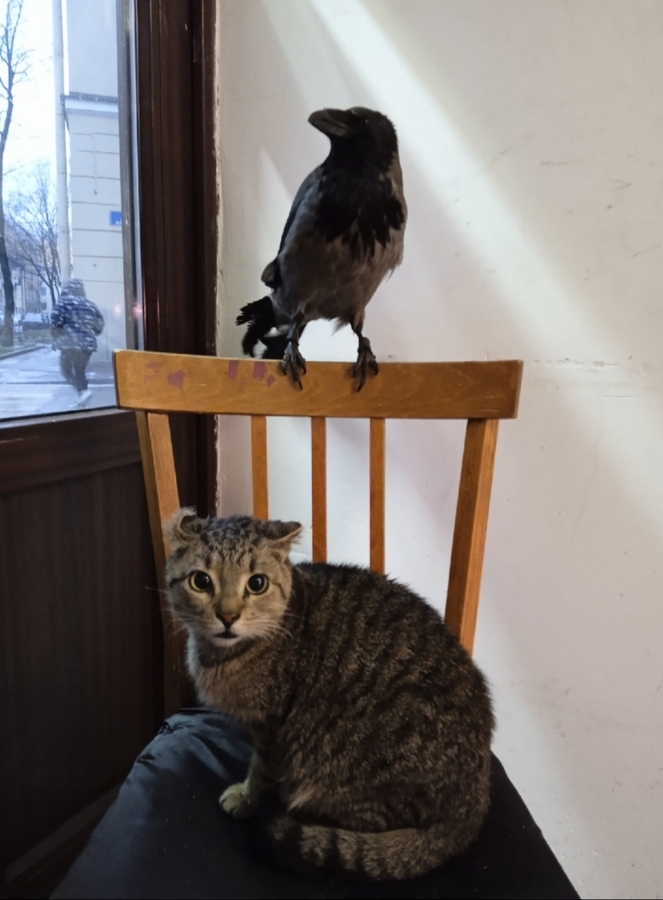 Потом, около автомобильных дисков, он нашел вороненка. Тоже битого, с повреждёнными крыльями. Уша его не тронула и приняла в их компанию.