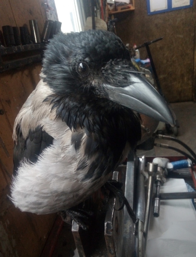 Вороненка Владимир зовёт Вороня. Вороня умеет садиться на руку и останавливаться по команде ( Володя говорит ему " Стоять. Бояться" smile ) И ещё Вороня встречает гостей и кивает им своей пушистой головой. Не всем, но часто кивает.