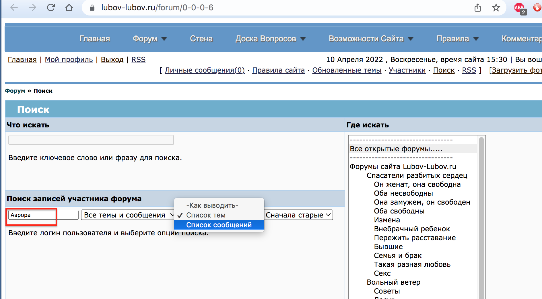 Выбираете темы или сообщения нужны, все темы или темы участника.